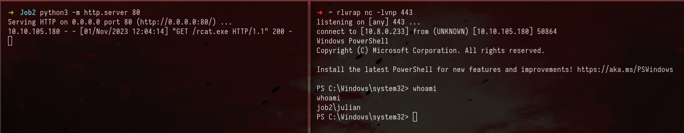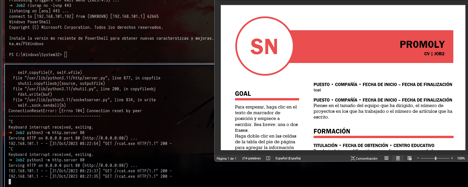 Job2 is a Windows hard machine created by xct. In this case, we aim to establish a foothold by crafting a malicious Word document and then escalate privileges through a CVE associated with a popular application.