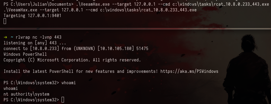After cloning the POC and obtaining the necessary DLLs from the Veeam application on the system, it was compiled, uploaded to the machine, and executed, providing a shell as system.